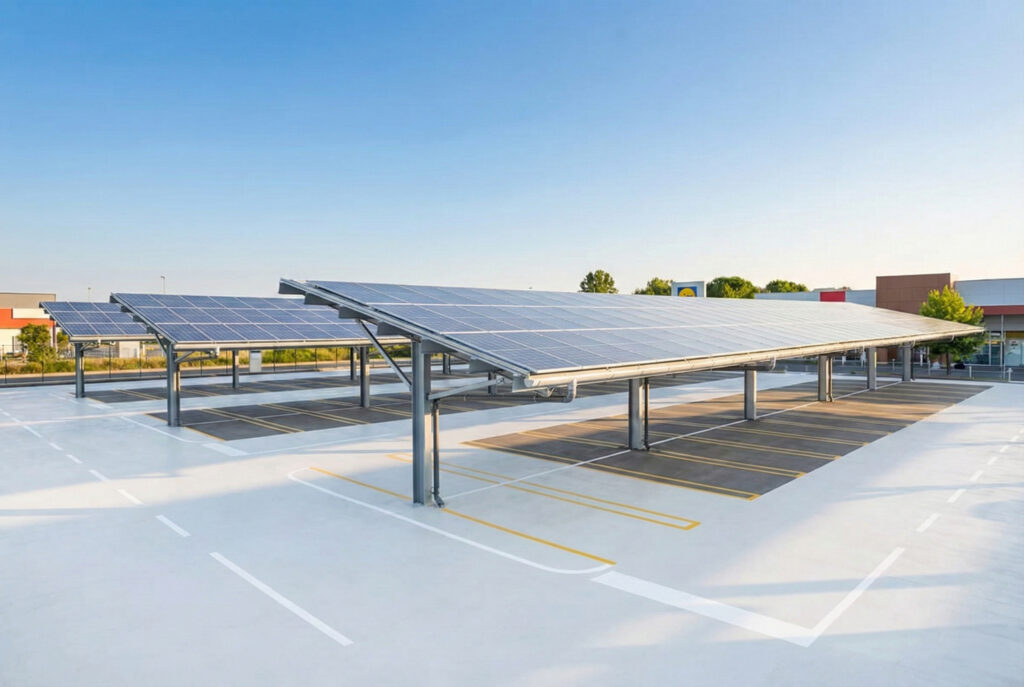 Une ombrière de parking photovoltaïque est une structure de couverture installée au-dessus d’un parc de stationnement, dont la toiture est constituée de panneaux solaires. Elle remplit une double fonction : protéger les véhicules des intempéries et du soleil, tout en produisant de l’électricité grâce au rayonnement capté.