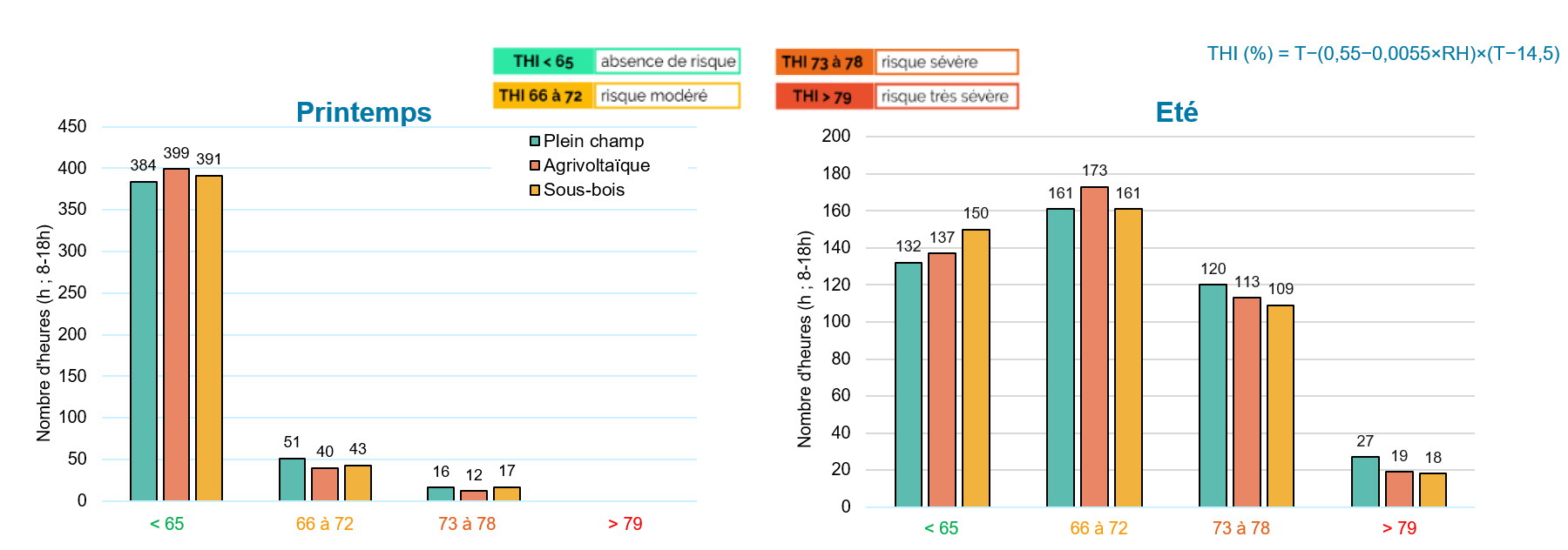 Par rapport à une référence en plein champ, la structure diminue de 15 heures le temps passé en zone de « risque sévère » et « très sévère » durant l’été. Ces résultats sont comparables à la protection offerte par un sous-bois, prouvant que la volière apporte un service d’adaptation climatique et améliore le confort des animaux.