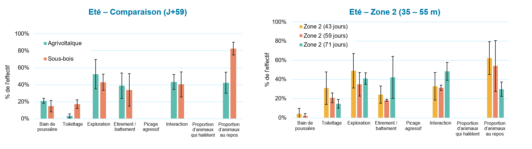 Grâce au protocole EBENE, qui permet de quantifier l’expression de comportements naturels, nous avons pu évaluer objectivement le bien-être animal. Les résultats sont clairs : il n’y a aucune différence significative dans la fréquence des comportements (toilettage, bain de poussière, exploration…) entre la zone agrivoltaïque et la zone témoin.